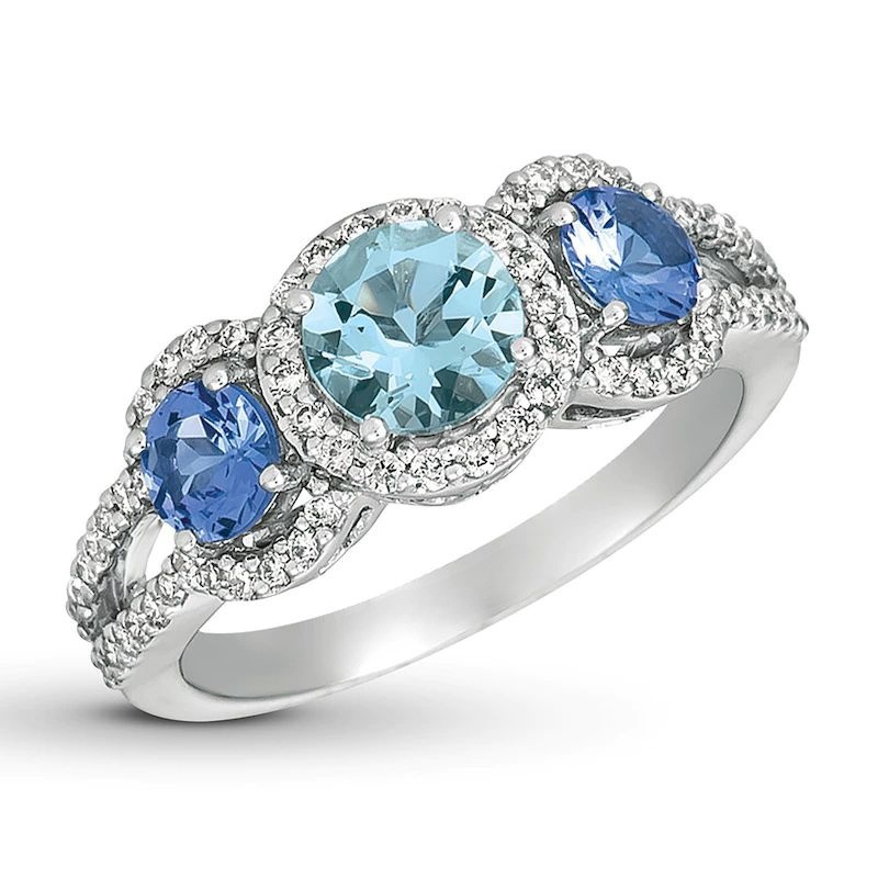 Blue Sapphire, Garnet and Diamond Tiara Ring in Sterling Silver and 10K Gold